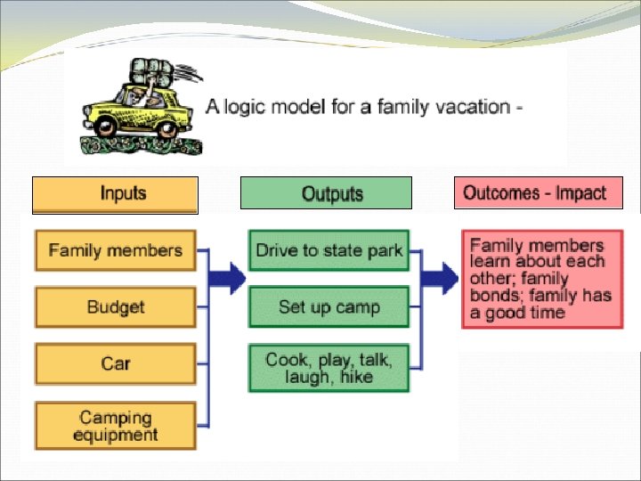 LOGIC MODEL A Logic Model is a program evaluation ROAD MAP and therefore, is the first step in evaluation. • Where are we going? • How do you plan to get there? • How will you know you are on course/on track? • What will tell you that you’ve arrived?