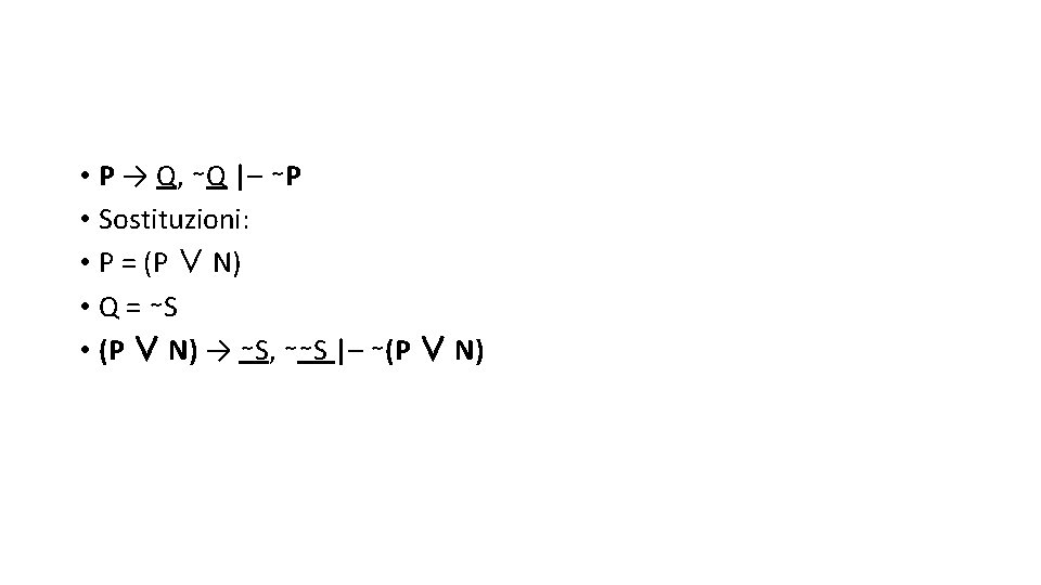 Esempio: • abbiamo dimostrato (es. 4. 18) che questa forma è valida: • P → Q, ∼Q |– ∼P • Allo stesso modo potremmo dimostrare la validità di qualsiasi esempio per sostituzione di tale forma. Quindi posso assumere questa regola derivata: • Da una fbf della forma φ → ψ e ∼ψ, (è lecito) inferire ∼φ.