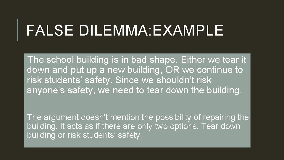 FALSE DILEMMA: EXAMPLE The school building is in bad shape. Either we tear it down and put up a new building, OR we continue to risk students’ safety. Since we shouldn’t risk anyone’s safety, we need to tear down the building. The argument doesn’t mention the possibility of repairing the building. It acts as if there are only two options. Tear down building or risk students’ safety.