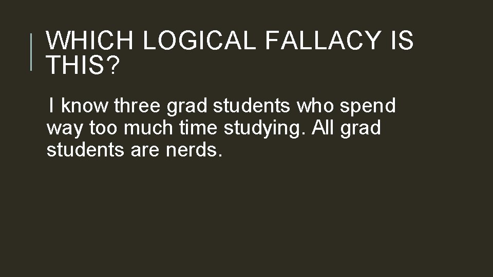 WHICH LOGICAL FALLACY IS THIS? I know three grad students who spend way too much time studying. All grad students are nerds. Hasty Generalization