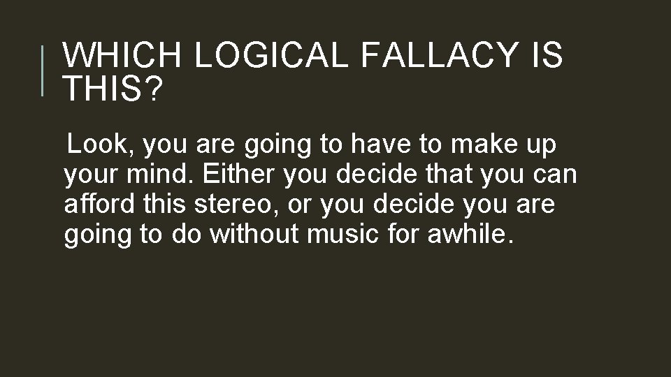 WHICH LOGICAL FALLACY IS THIS? Look, you are going to have to make up your mind. Either you decide that you can afford this stereo, or you decide you are going to do without music for awhile. False dilemma