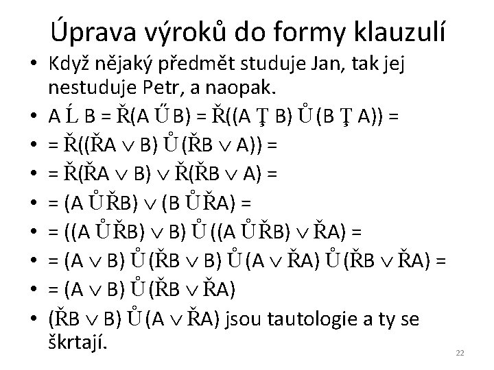 Převod věty z přirozeného jazyka do jazyka predikátové logiky 1. řádu • • • • • Ne všichni jsou zároveň bohatí a šťastní. Žádný člověk není zároveň bohatý a šťastný. Chytrá lama nejí rostlinu, která je pro ni jedovatá. Existuje lama, která má ráda všechny rostliny, které nejsou trnité. Hedvika má ráda pouze rostliny, které nejsou trnité. Hedvika má ráda všechny rostliny, které nejsou trnité. Pouze Evženovi kamarádi znají Evženovo tajemství. Všichni Evženovi kamarádi znají Evženovo tajemství. Nikdo si neváží studovaného podvodníka. Nikdo si nenajme právníka, který nevyhrál ani jeden spor. Nikdo si nekoupí dům, pokud tento dům není zkolaudovaný. Existují domy, které si nikdo nekoupí, i když jsou zkolaudované. Každý člověk přijme práci, pokud je dobře placená. Existují práce, které někteří lidé nepřijmou, i když jsou dobře placené. Všichni mají rádi napínavé příběhy. = Každý má rád napínavý příběh. Dobré prase všechno spase. Brána má smysl, jen když se neotevře všem. Evžen jí všechno, co vaří maminka, ale jen něco z toho, co vaří závodka. Ten, kdo vyřeší alespoň jeden příklad / všechny příklady, je chytrý. 21