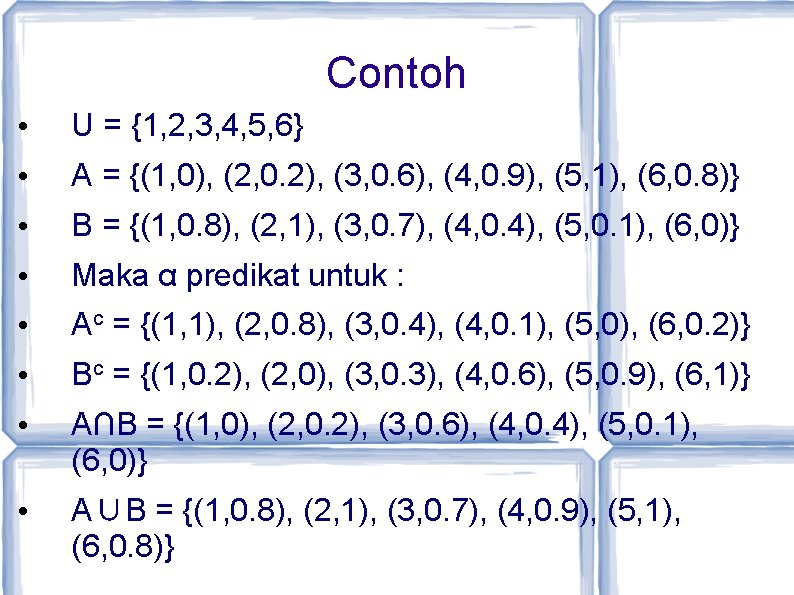 ![Contoh • Misal derajat keanggotaan 27 tahun pada himpunan MUDA adalah 0. 6 (µMUDA[27] Contoh • Misal derajat keanggotaan 27 tahun pada himpunan MUDA adalah 0. 6 (µMUDA[27]](https://slidetodoc.com/presentation_image_h2/9fd8576ef55be25dae5f1bb8964b9605/image-19.jpg)