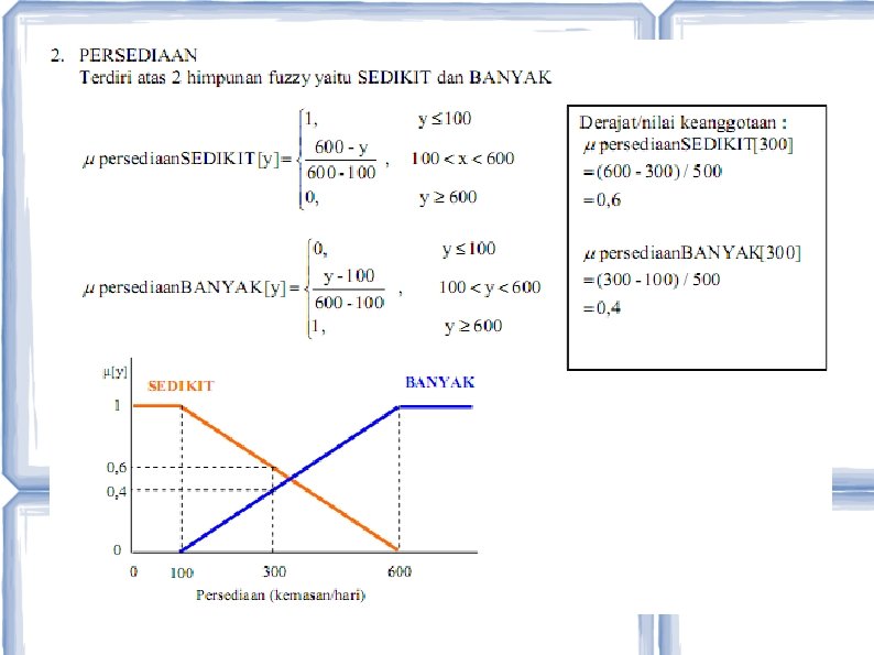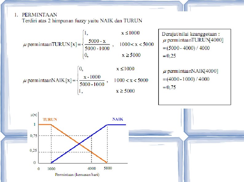 Studi Kasus 1 • • Apabila proses produksi perusahaan tersebut menggunakan 4 aturan fuzzy : – R 1 : IF permintaan turun AND persediaan banyak THEN produksi barang berkurang – R 2 : IF permintaan turun AND persediaan sedikit THEN produksi barang berkurang – R 3 : IF permintaan naik AND persediaan banyak THEN produksi barang bertambah – R 4 : IF permintaan naik AND persediaan sedikit THEN produksi barang bertambah Berapa kemasan makanan jenis ABC yang harus diproduksi, jika jumlah permintaan sebanyak 4000 kemasan dan persediaan di gudang masih 300 kemasan?