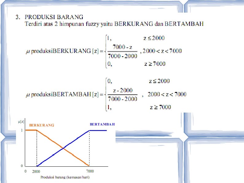 Contoh • IF permintaan turun AND persediaan banyak THEN produksi barang berkurang • IF permintaan naik AND persediaan sedikit THEN produksi barang bertambah – Dimana : – Permintaan, persediaan : variabel masukan – Produksi barang : variabel keluaran – Turun, naik : kategori himpunan fuzzy dari permintaan – Banyak, sedikit : kategori himpunan fuzzy dari persediaan – Berkurang, bertambah : kategori himpunan fuzzy dari produksi barang
