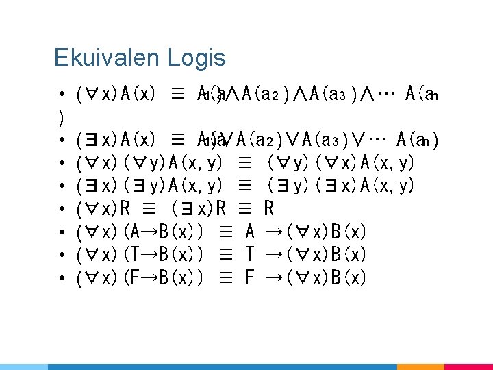 Istilah Dalam Logika Predikat ▷Term : kata benda atau subjek ▷Predikat : properti dari term ▷Fungsi proposisional=fungsi Kuantor ○Universal: yang selalu bernilai benar (∀). ○Eksistensial: bisa bernilai benar atau salah(∃).
