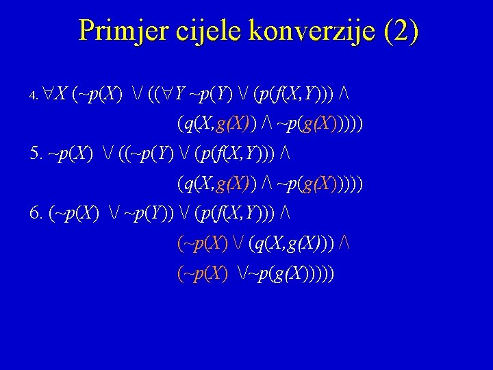 5. Uklanjanje univerzalnih kvant. Uklanjamo sve i pretpostavljamo da su sve promjenljive univerzalno kvantifikovane. X Y Z q(h(Y)) / p(h(Y), X) / r(X, Z) postaje q(h(Y)) / p(h(Y), X) / r(X, Z) 6. Distribuiramo disjunkcije Napišemo formulu kao konjunktivnu normalnu formu: j / / postaje (j / / j /