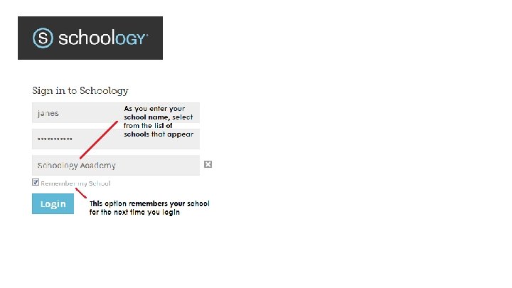Username Login 1. Go to app. schoology. com. 2. Click Log In on the top right. 3. Enter your Username, Password, and the name of your school (As you type, a menu will appear that enables you to select your school). 4. Select your school from the list. 5. Check the box to Remember my School(optional). This setting saves your school on the current machine or device, and browser. 6. Click Log in.