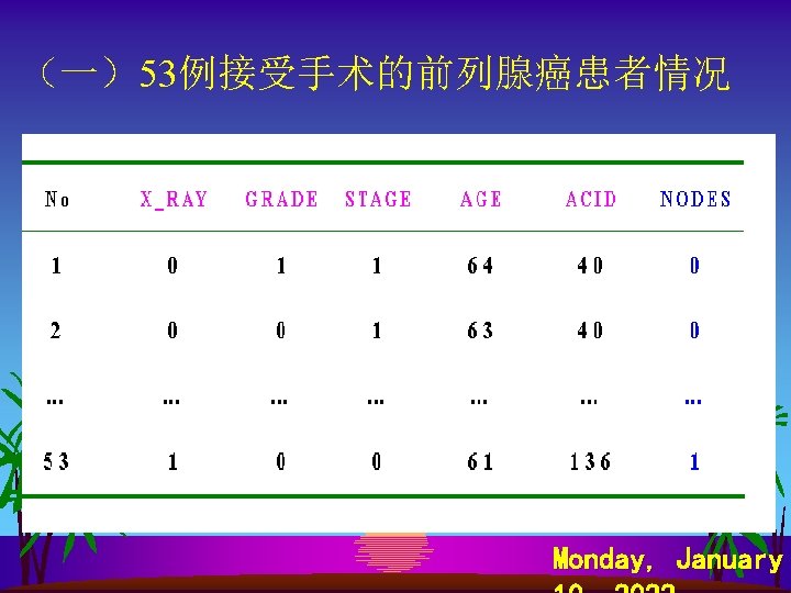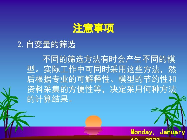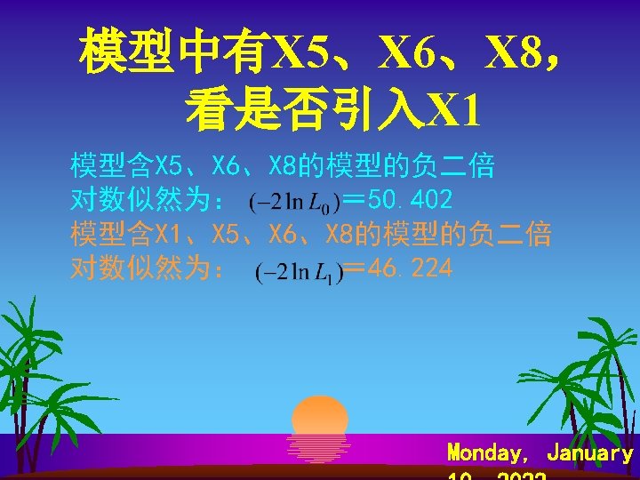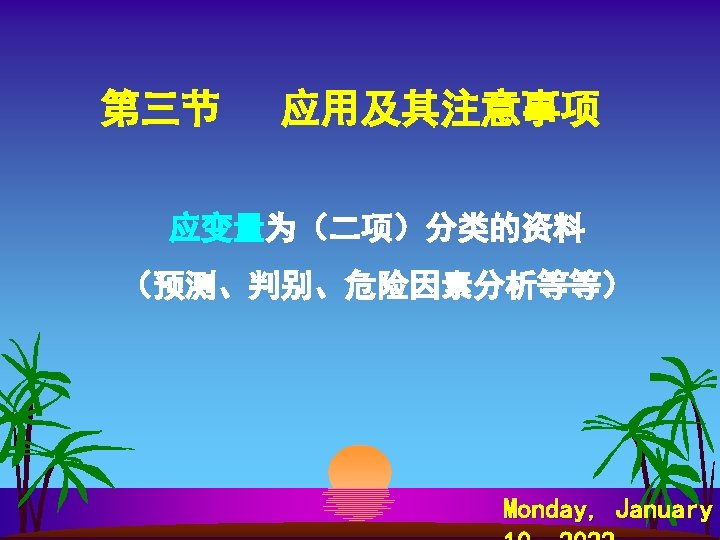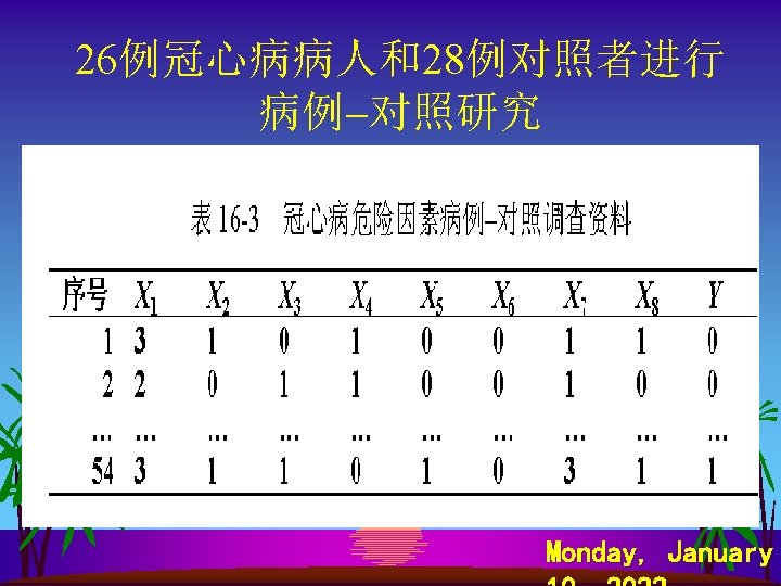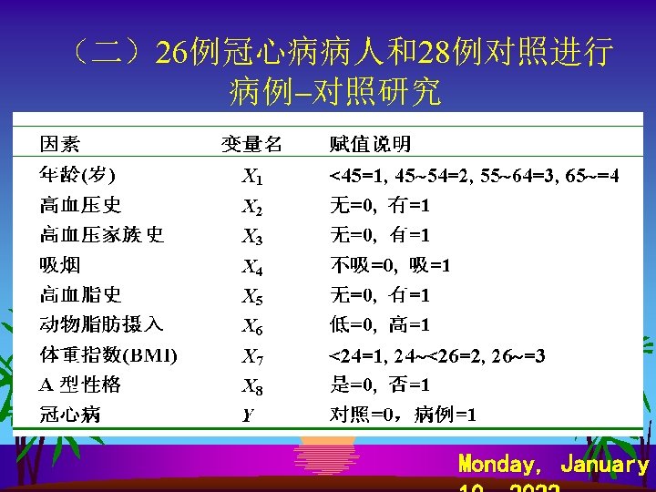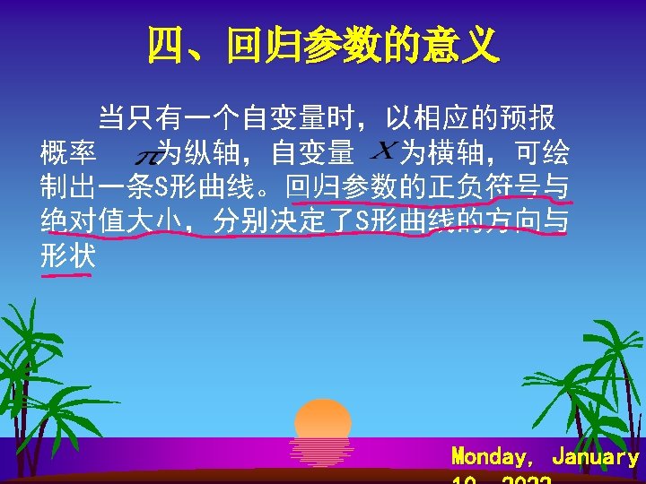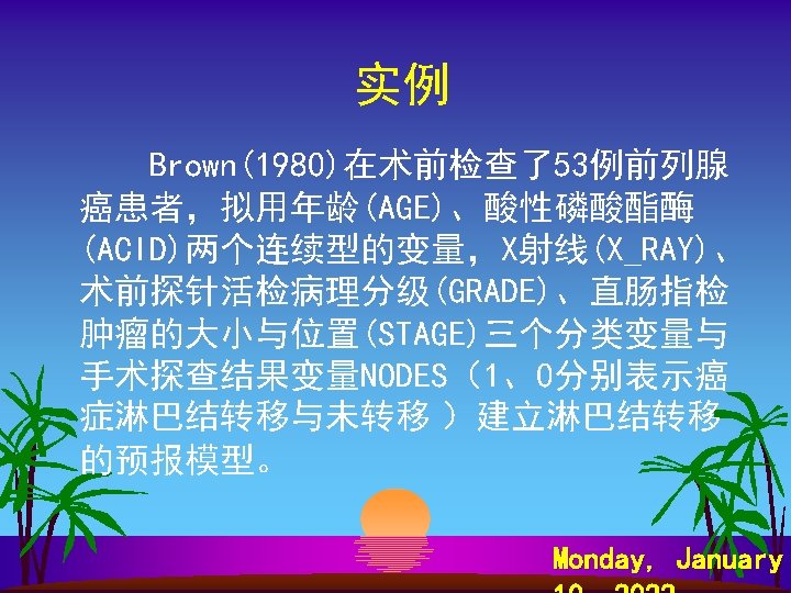 SPSS软件计算 s s s s Analyze Regression Binary Logistic… Dependent: y Covariates: x 1~ x 8 Method: Forward Ward Save…—— Predicted Values Probabilities Group membership Option—— CI for exp 95% Probability for Stepwise Entry: 0. 1 Removal 0. 15 Monday, January