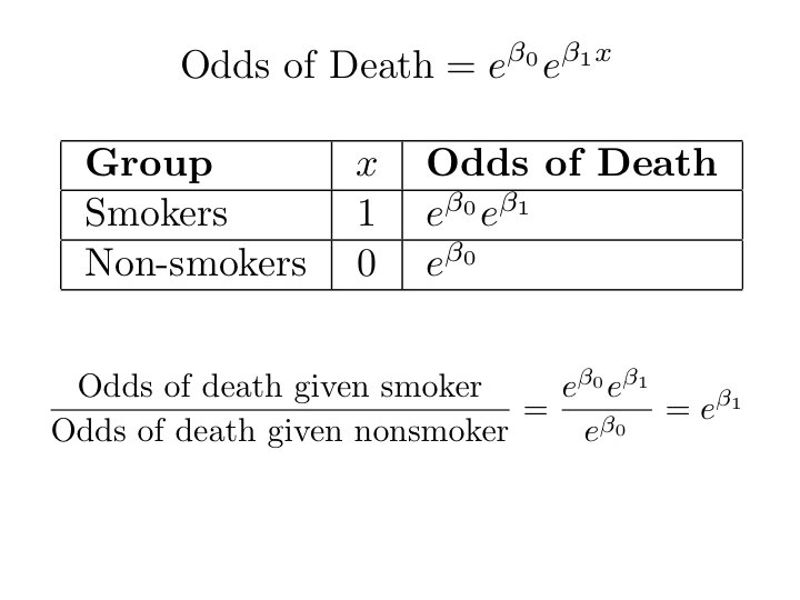 In terms of plain odds, • (Exponential function of) the logistic regression coefficients are odds ratios • For example, “Among 50 year old men, the odds of being dead before age 60 are three times as great for smokers. ”
