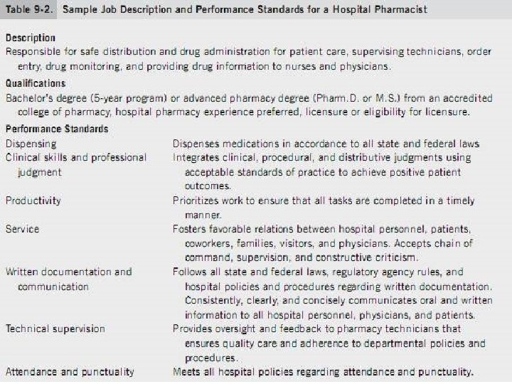 RECRUITMENT AND PLACEMENT v The following is a suggested list of interview preparation steps: v [1] Send information about the position to the candidate. v It is helpful to provide candidates with specific information about the job description and standards for performance to help them prepare for the interview. v [1] Identify interview objectives. It is important to ask your self what you want to achieve with the interviews. For example, if you have acute, immediate needs, you may only consider candidates who are available immediately. However, if your interest is long term, you may be willing to wait for an excellent candidate to graduate from pharmacy school or complete a commitment made to another employer. v [1] Review the position description and performance standards. The position description and performance standards will form the basis of your interview questions. Examples of a position description and performance standards are provided in Table 9 -2. v [1] Develop a list of interview questions. Pay particular attention to assessing the requirements of the job specified in the performance standards. v [1] Study the applications and resumes. Look for accomplishments and credentials on which you want the candidate to expand. Also note frequent job changes, gaps in employment, demotions, inconsistencies in history, or incomplete information on references about which you want to learn more. v [1] Schedule a quiet, uninterrupted interview. It shows disrespect to the candidate if you permit interruptions and distractions from giving your full attention to the interview. v [1] Alert co workers whom you want the candidate to meet so that they can schedule a time to meet.