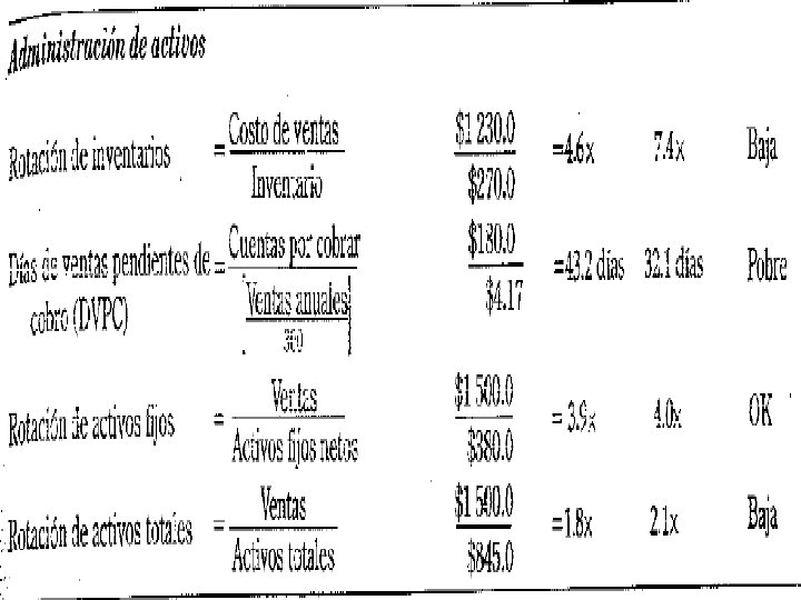 RAZON DE ADMINISTRACIÓN DE ACTIVOS v Conjunto de razones que miden la eficiencia de una empresa para administrar sus activos. v Estas razones se dividen en: § § Rotación de inventarios, mide las veces que rotan los inventarios en el año. Rotación de cuentas por cobrar, Indica el plazo promedio que requiere la empresa para cobrar las ventas al crédito. Rotación de los activos fijos, mide la eficiencia de la empresa para utilizar su planta y equipo y ayudar a generar venta. Rotación de activos totales, mide la rotación de la totalidad de los activos de la empres. v Rotación inventarios Costo de Ventas Inventarios v Rotación cobrar cuenta por Cuentas por Cobrar Ventas / 360 v Rotación de activo fijo Ventas____ Activo fijo Neto v Rotación de activo total Ventas____ Activo Total