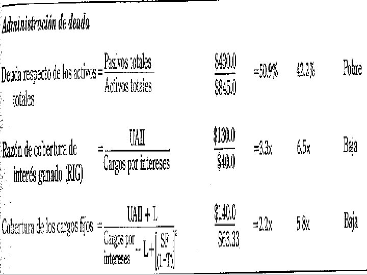 RAZON DE ADMINISTRACIÓN DE DEUDA v Es la medida en la cual la empresa se financia por medio de deudas, financieramente se le conoce como apalancamiento. v Razón endeudamiento v Estas razones se dividen en: v Rotación intereses § § Razón de endeudamiento, mide el porcentaje de los activos financiados a la empresa por los acreedores Razón de rotación de intereses ganados, mide la capacidad de la empresa para satisfacer sus pagos anuales de intereses. § Rotación de cuentas por pagar, mide los días pendientes de pago de cuentas por pagar comerciales § Razón costo financiero, mide el costo de la deuda financiera. Pasivo total Activo total UAII____ Cargos por Intereses v Días pendientes de pago cuentas por pagar comerciales___ Costo de ventas / 360 v Costo financiero Cargos por intereses___ Cuenta por pagar financiera