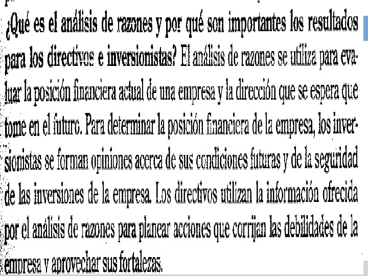 ANALISIS DE RAZONES FINANCIERAS v El valor real de los estados financieros radica en el hecho que pueden utilizarse para ayudar a predecir la posición financiera de una empresa en el futuro y determinar las utilidades y los dividendos esperados. v El primer paso del análisis de estados financieros son a través de razones financieras, que tienen como propósito mostrar la relación que existen entre las cuentas de los estados financieros. v Las razones financieras convierten las cifras en valores relativos, o razones, nos permite comparar la posición financiera de la empresa con otras empresas. v Se utilizan para hacer presentaciones a terceros para que los estados financieros se comprendan no solo a nivel de cifras si no también a nivel de razonamiento lógico.