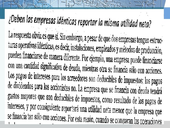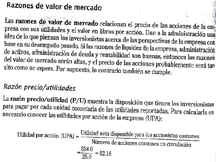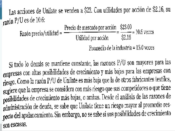 RAZON DE ADMINISTRACIÓN DE DEUDA v Es la medida en la cual la empresa se financia por medio de deudas, financieramente se le conoce como apalancamiento. v Razón endeudamiento v Estas razones se dividen en: v Rotación intereses § § Razón de endeudamiento, mide el porcentaje de los activos financiados a la empresa por los acreedores Razón de rotación de intereses ganados, mide la capacidad de la empresa para satisfacer sus pagos anuales de intereses. § Rotación de cuentas por pagar, mide los días pendientes de pago de cuentas por pagar comerciales § Razón costo financiero, mide el costo de la deuda financiera. Pasivo total Activo total UAII____ Cargos por Intereses v Días pendientes de pago cuentas por pagar comerciales___ Costo de ventas / 360 v Costo financiero Cargos por intereses___ Cuenta por pagar financiera