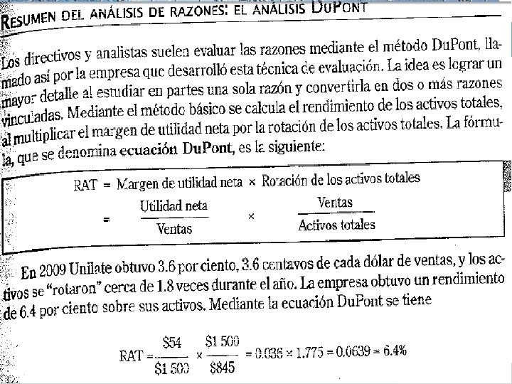 RAZON DE ADMINISTRACIÓN DE ACTIVOS v Conjunto de razones que miden la eficiencia de una empresa para administrar sus activos. v Estas razones se dividen en: § § Rotación de inventarios, mide las veces que rotan los inventarios en el año. Rotación de cuentas por cobrar, Indica el plazo promedio que requiere la empresa para cobrar las ventas al crédito. Rotación de los activos fijos, mide la eficiencia de la empresa para utilizar su planta y equipo y ayudar a generar venta. Rotación de activos totales, mide la rotación de la totalidad de los activos de la empres. v Rotación inventarios Costo de Ventas Inventarios v Rotación cobrar cuenta por Cuentas por Cobrar Ventas / 360 v Rotación de activo fijo Ventas____ Activo fijo Neto v Rotación de activo total Ventas____ Activo Total