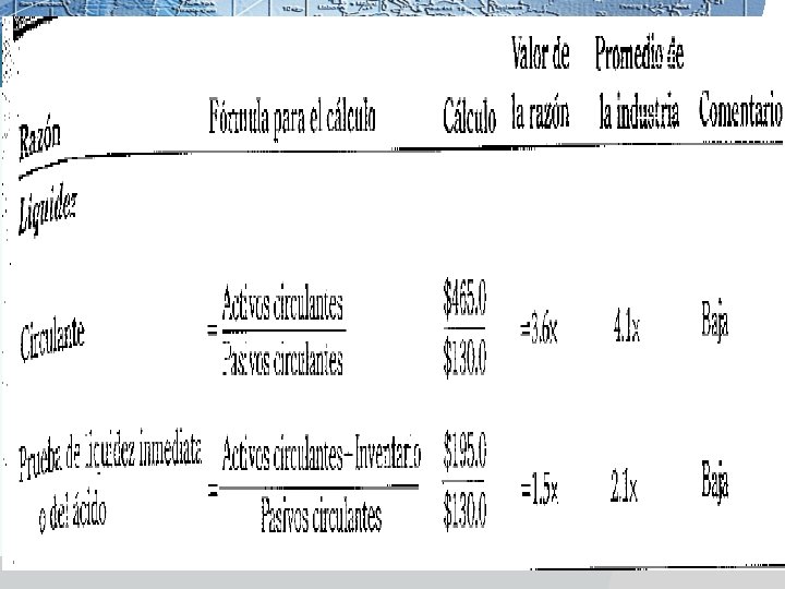 RAZON DE LIQUIDEZ v Razón de liquidez, muestra la capacidad que tiene una empresa para satisfacer sus obligaciones a corto plazo. v Los activos a corto plazo tienen la característica de ser convertibles en efecto a corto plazo, ejemplo, inversiones en valores, cuentas por cobrar, inventarios. v La razón liquidez muestra la relación que existe entre el efectivo de una empresa y otros activos circulantes y sus pasivos circulantes. v La razón de liquidez existe dos formas de calcularse. § § Razón Circulantes, indica en que medida los pasivos circulantes están cubiertos por los activos que se espera que se conviertan en efectivo en futuro cercano. Razón Rápida o prueba de acido. Mide la capacidad de la empresa para cubrir sus pasivos circulantes sin recurrir a sus ventas v Razón Circulante. Activo circulante Pasivo circulante v Razón Rápida Prueba de acido. Activo circulante- Inventarios Pasivo circulante
