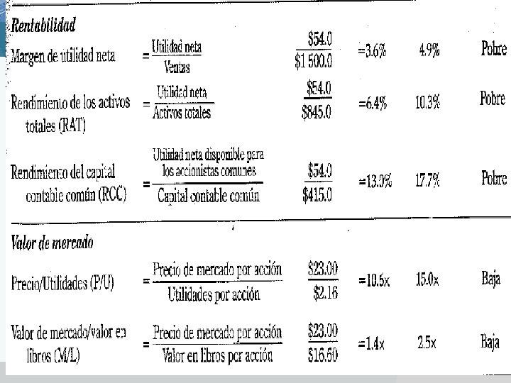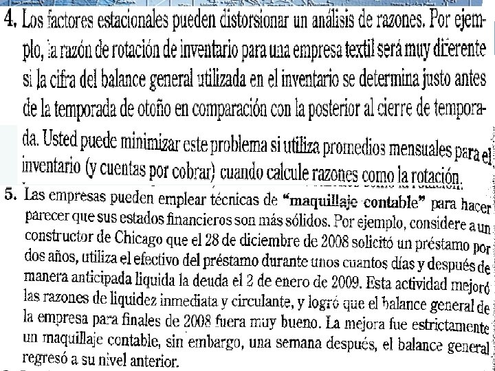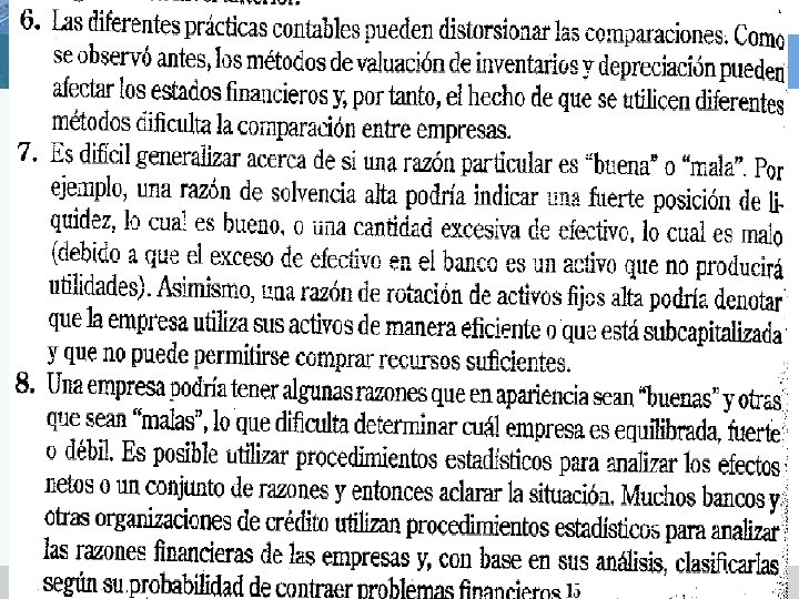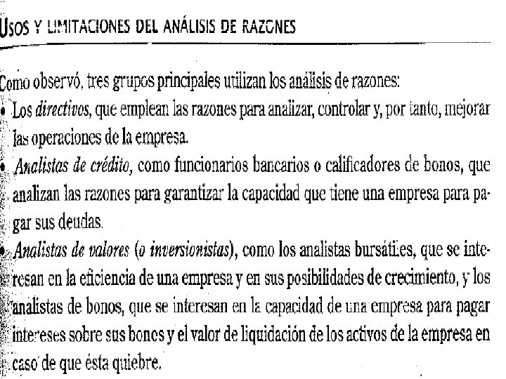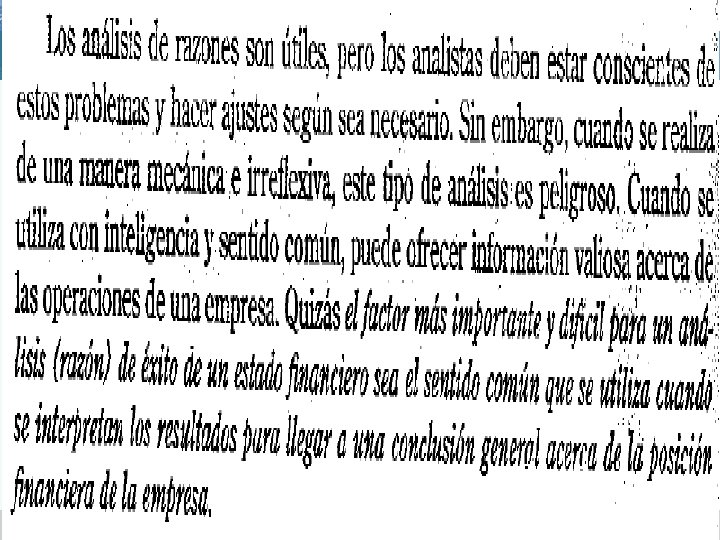 ANALISIS DE RAZONES FINANCIERAS v El valor real de los estados financieros radica en el hecho que pueden utilizarse para ayudar a predecir la posición financiera de una empresa en el futuro y determinar las utilidades y los dividendos esperados. v El primer paso del análisis de estados financieros son a través de razones financieras, que tienen como propósito mostrar la relación que existen entre las cuentas de los estados financieros. v Las razones financieras convierten las cifras en valores relativos, o razones, nos permite comparar la posición financiera de la empresa con otras empresas. v Se utilizan para hacer presentaciones a terceros para que los estados financieros se comprendan no solo a nivel de cifras si no también a nivel de razonamiento lógico.