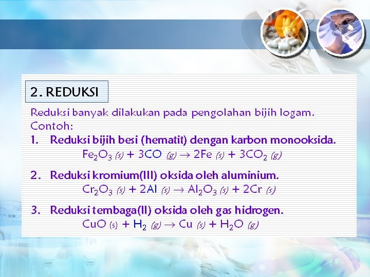 OKSIDATOR DAN REDUKTOR OKSIDATOR : Zat yang mengoksidasi zat lain, tetapi zat Tersebut mengalami reaksi reduksi (penurunan bilok) Ciri-ciri oksidator: § Memiliki bilok tinggi § Dalam bentuk molekul maupun ion mudah mengikat elek tron § Dalam sistim periodik unsur ada di sebelah kanan Contoh : KMNO 4 Mn bervalensi +7 K 2 Cr 2 O 7 Cr bervalensi +6 KCl. O 3 Cl bervalensi +5