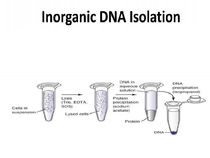 Non-Organic DNA Extraction Procedure 1. Cell Lysis Buffer - lyse cell membrane, nuclei are intact, pellet nuclei. 2. Resuspend nuclei in Protein Lysis Buffer containing a high concentration of Proteinase K. Lyse nuclear membrane and digest protein at 65 o. C for 2 hours. Temperature helps denature proteins, and Proteinase K auto digests itself 3. To remove proteinaceous material, Li. Cl is added to a final concentration of 2. 5 M, and incubated on ice. Proteins precipitate out and are pelleted by centrifugation.