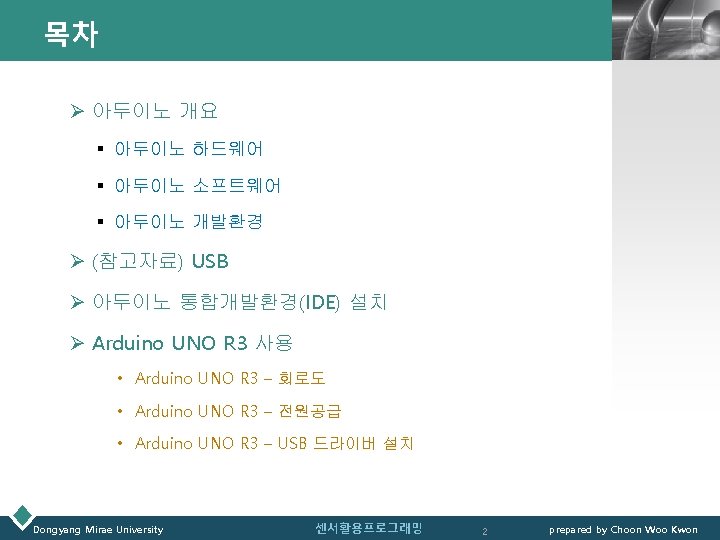 Arduino UNO R 3 LOGO □ 아두이노(Arduino UNO R 3) - Arduino UNO R 3 - Korduino UNO R 3 * Arudino UNO R 3 PDF 회로도 http: //www. jkelec. co. kr/arduino/uno-r 3/Arduino_Uno_Rev 3 -schematic[1]. pdf http: //arduino. cc/en/uploads/Main/Arduino_Uno_Rev 3 -schematic. pdf Dongyang Mirae University 센서활용프로그래밍 10 prepared by Choon Woo Kwon