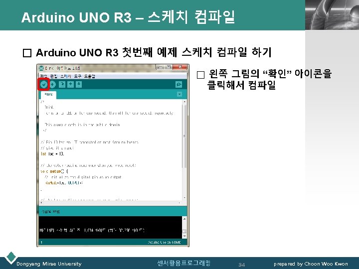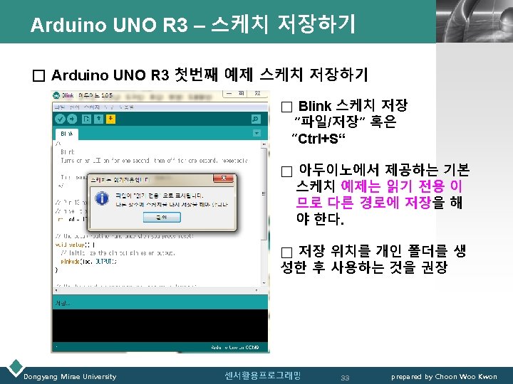 Arduino UNO R 3 – 스케치 불러오기 LOGO □ Arduino UNO R 3 첫번째 예제 스케치 불러오기 □ Blink 스케치 예제 Dongyang Mirae University 센서활용프로그래밍 32 prepared by Choon Woo Kwon