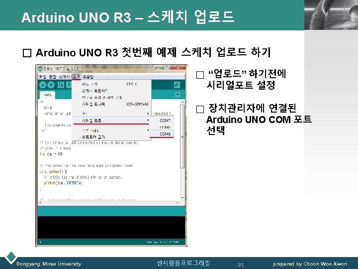 Arduino UNO R 3 – USB 드라이버 업데이트 LOGO □ USB 장치 드라이버 업데이트 Dongyang Mirae University 센서활용프로그래밍 27 prepared by Choon Woo Kwon