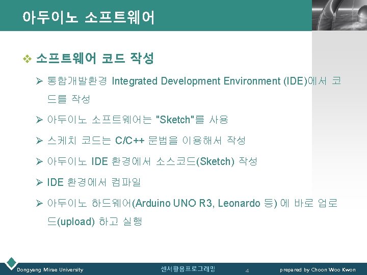 아두이노 하드웨어 LOGO v 아두이노 하드웨어 Ø AVR CPU 기반의 실제 타깃 보드 Ø 수십여 가지의 센서들, LCD, 모터, 네트워크 등 쉴드(shield)라고 부르는 모듈을 연결하여 확장이 가능 Ø Arduino UNO R 3(최대속도 16 MHz)가 가장 인기 있음 Ø UNO보다 많은 I/O 확장을 원한다면 Arduino Mega 2560 Ø ARM 기반의 고성능 CPU를 기반으로 하는 Arduino DUE(최대 속 도 84 MHz) v 아두이노 Official board § http: //www. arduino. cc/en/Main/Hardware v 아두이노 Compatible board § http: //www. deviceshop. net § http: //www. toolparts. co. kr Dongyang Mirae University 센서활용프로그래밍 3 prepared by Choon Woo Kwon