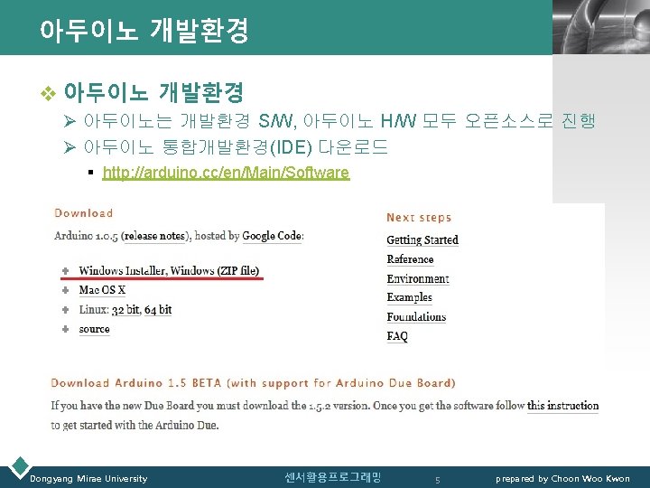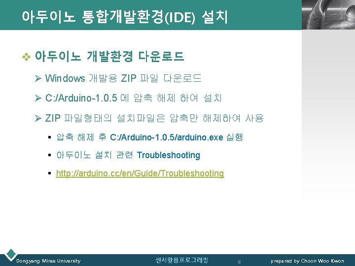 아두이노 통합개발환경(IDE) 설치 LOGO v 아두이노(Arduino) 통합개발환경(IDE : Integrated Development Environment) 설치 □ Arduino Official Board (click ☞) http: //www. arduino. cc/en/Main/Hardware ü Windows, Mac OS X, Linux 용 ü 설치방식 § Windows Installer 버전 : 직접 컴퓨터에 설치 § 압축 파일(zip) 형식 : 압축해제 후 바로 실행(arduino. exe) □ 대학 내 설치용 압축 파일 다운로드(Windows 버전) (click☞) http: //cwkwon. dongyang. ac. kr/my_lecture/lec_arduino/arduino-1. 6. 5 -r 2 -windows. zip Dongyang Mirae University 센서활용프로그래밍 7 prepared by Choon Woo Kwon