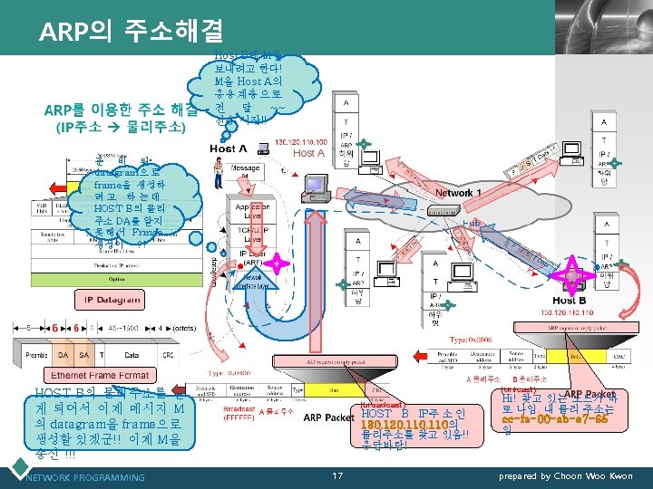 ARP 프로토콜 LOGO Logical Address 130. 120. 110. 100 130. 120. 110 (IP주소) ARP RARP 64 -e 5 -99 -60 -89 -a 8 cc-fa-00 -ab-e 7 -65 Physical Address (Ethernet 주소) NETWORK PROGRAMMING (Ethernet 주소) 16 prepared by Choon Woo Kwon