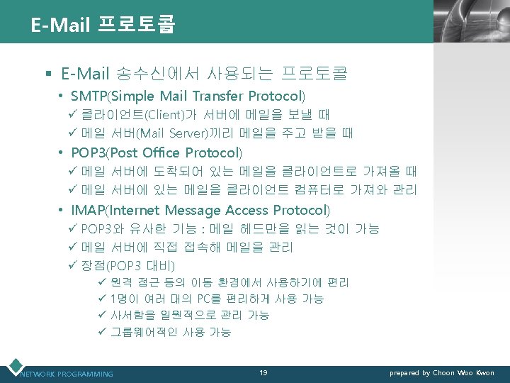 E-Mail 송수신 : WEB Mail 방식 web mail 방식 e-mail E-mail 서버 (daum. net) SM TP DNS 서버 SMTP Internet ww (w ) ht tp ww (w tp ) 1. www 이 용 메일서버 접속 Notebook 1 (Mr. Lee) NETWORK PROGRAMMING 4. 계정 확인 후 수신자 mailbox 저장 DNS 서버 ht 3. 메일 서 버(수신) IP 확보 E-mail 서버 (naver. com) TP SM 2. 보낼 메일 잠시 저장 LOGO 5. www 이용 메일서버 메일 을 확인하고자 할 경우 21 6. www 이용 메일서버 접속 후 메일 내용을 수신 Notebook 2 (Ms. Park) prepared by Choon Woo Kwon