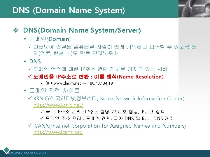 루트 도메인(Root Domain) LOGO • DNS 루트 서버 관리 : ICANN • 13개 root name servers : (A~M). root-servers. net ü 물리 서버 개수 : 13개 이상(hw/sw failure 대비) ü 최초 위치 : 미국지역 10개, Stockholm(I), Amsterdam (K), Tokyo (M) ü 현재 위치 : 물리적 서버 A/C/E/F/G/I/J/K/L/M 여러 대륙에 위치(using anycast) NETWORK PROGRAMMING