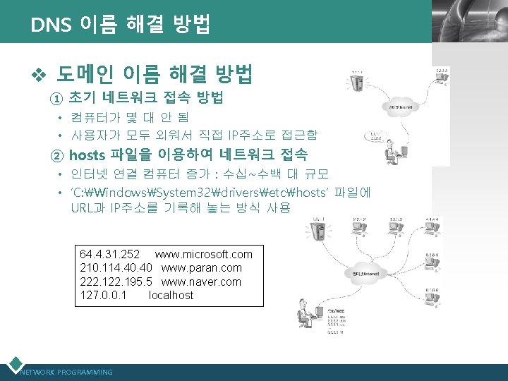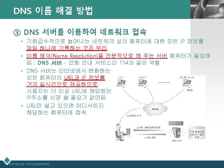 도메인 이름 체계 LOGO • 초창기 인터넷에서는 1대의 DNS 서버 만으로도 충분히 IP주소와 이름의 관리가 가능 • 인터넷 폭발적 확장 -> 몇 대 DNS 서버로는 실시간으로 주소해결 불가 • 그래서 트리 구조와 같은 ‘도메인 이름 체계를 고안함 • 전세계 13개 이상 Root DNS • (A~M). ROOT-SERVERS. NET • 국내 Root Mirror Server : F/J/M ROOT(. ) 도메인 (국가코드)최상위 도메인 cc. TLD Country Code Top-Level Domain (일반)최상위 도메인 g. TLD Generic Top-Level Domain com naver www org edu google ibm news mil gov 2차 도메인 SLD Second-Level Domain co kp ac www lib computer cn hs dongyang search naver. com 도메인 (Naver에서 관리하는 호스트) kr net go snu kaist jp br pe seoul dit cwkwon dongyang. ac. kr 도메인 (동양미래대학교에서 관리하는 호스트) NETWORK PROGRAMMING
