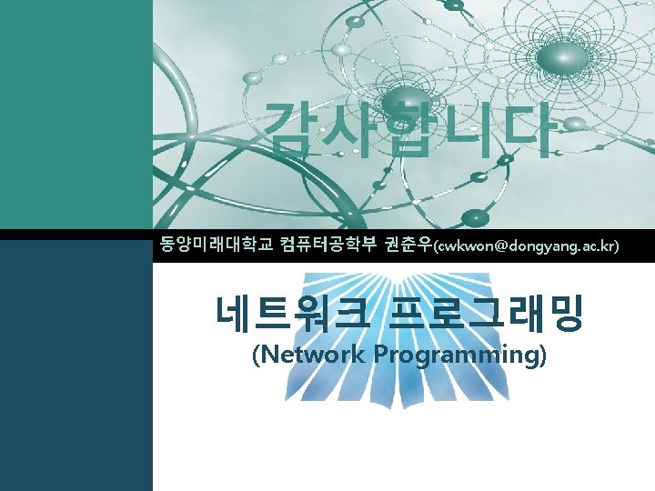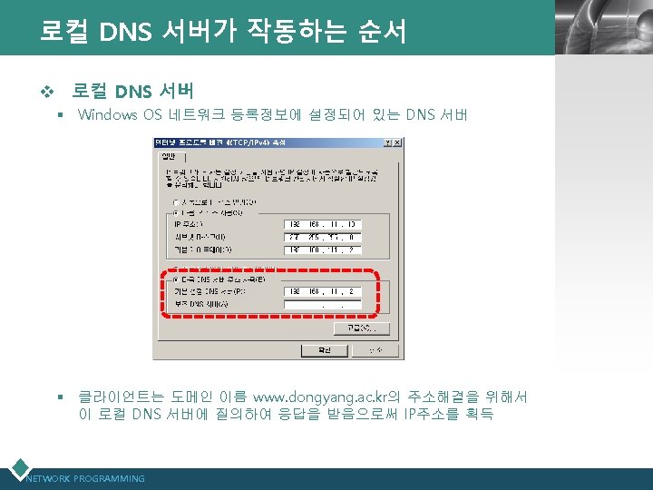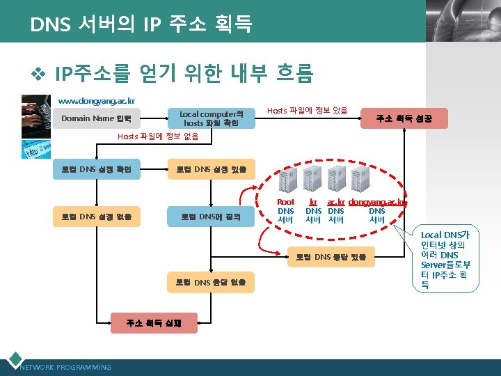 로컬 DNS 서버 작동 순서 LOGO v DNS 서버를 통해 IP 주소를 획득하는 흐름도 Root DNS 서버 kr DNS 서버 dongyang. ac. kr DNS 서버 DB ⑥ 질의 ⑧ 질의 ⑨ 응답 dongyang. ac. kr ⑦ 응답/ac. kr DNS 정보 ⑤ 응답/kr DNS 서버 정보 ⑩ 질의 ⑪ 응답/ IP주소 203. 29. 39. 70 ④ 질의 ② 질의 Local DNS 서버 ① Client computer ⑫ 응답 • 도메인 이름 www. dongyang. ac. kr을 URL로 입력 • Local computer에 설정된 Local DNS 서버 주소 확인 NETWORK PROGRAMMING 캐시 DB ③ 로컬 서버의 cache DB 검색 • • <Routing Table> www 203. 249. 39. 70 lib 203. 237. 164. 250 computer 203. 249. 39. 10 fa 203. 237. 166. 10