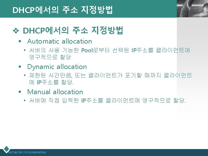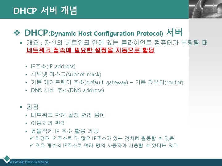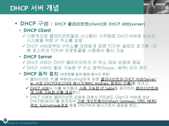 DHCP 서버 설정 v Windows에서 DHCP 서버 설정 NETWORK PROGRAMMING LOGO