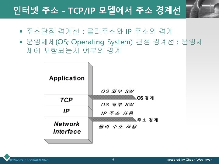 인터넷 주소 - TCP/IP 주소 LOGO v TCP/IP에서 주소와 계층간의 관계 OSI TCP/IP Application 계층 Processes/Applications Transport 계층 Network 계층 Data link 계층 Physical 계층 NETWORK PROGRAMMING TCP Address (주소) Port address UDP ICMP/IGMP/ARP/RARP IP address Underlying physical network Physical address IP (하위 물리 네트워크) 5 prepared by Choon Woo Kwon