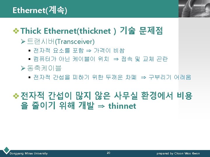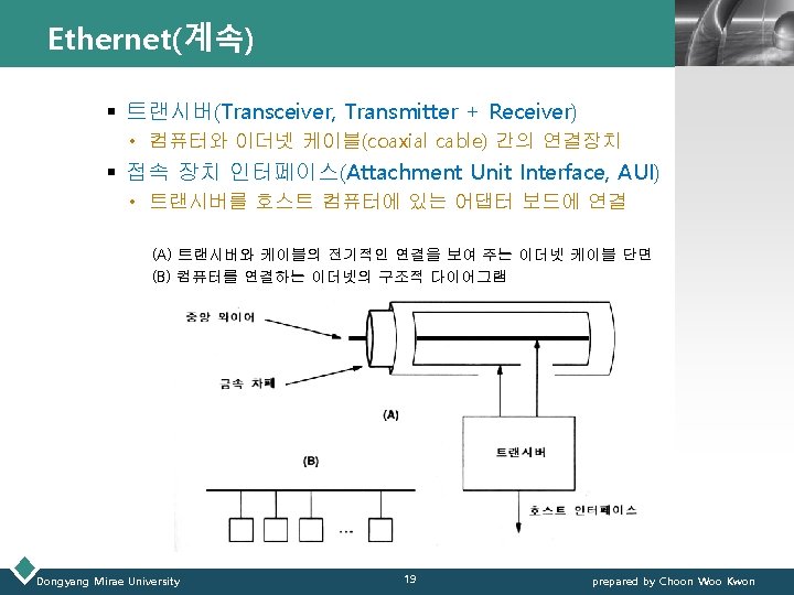Ethernet(이더넷) LOGO Ø Thick Ethernet : 초기 Ethernet 기술 § 동축케이블 : 지름 ½”, 10 BASE 5(10 Mbps, baseband, 500 m까지 ) § Transceiver : MAU(Medium Attachment Units) § AUI(Attachment Unit Interface) : D-connector(15 pin) Dongyang Mirae University 18 prepared by Choon Woo Kwon