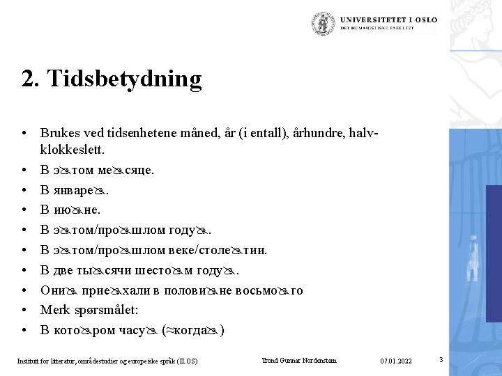 2. Tidsbetydning • ved uke: • на э той/про шлой/бу дущей/сле дующей неде ле • Nærvær av avhengig ledd i genitiv medfører skifte av preposisjon og kasus: • В неде лю наводне ния i uken med oversvømmelse • Merk uttrykket: на друго й день neste dag Institutt for litteratur, områdestudier og europeiske språk (ILOS) Trond Gunnar Nordenstam 07. 01. 2022 6