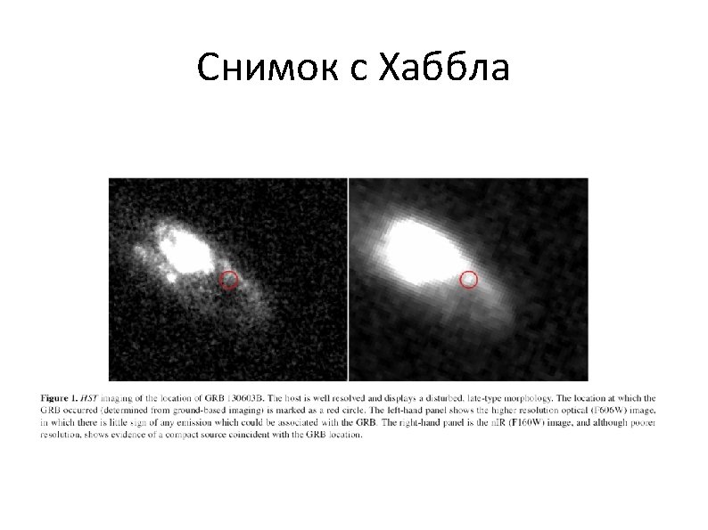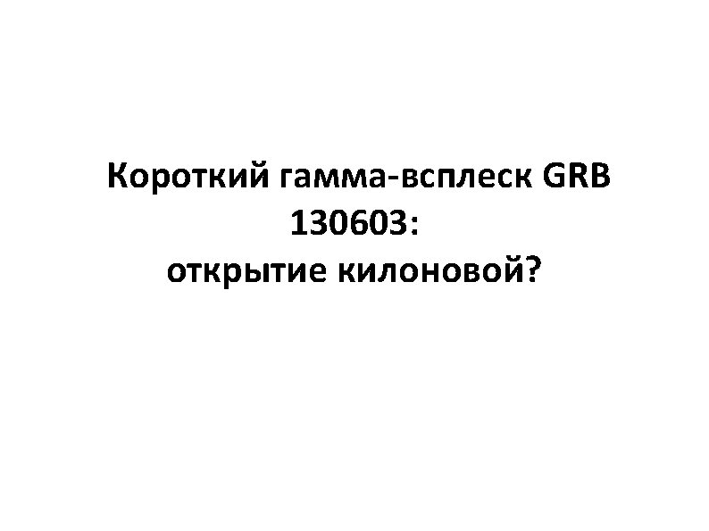 A search for kilonova emission associated with GRB 130603 B: the smoking gun signature of a compact binary merger event N. R. Tanvir, A. J. Levan, A. S. Fruchter, J. Hjorth, K. Wiersema, R. Tunnicliffe, A. de Ugarte Postigo • • Submitted on 20 Jun 2013 ar. Xiv: 1306. 4971 v 1 The nature of short duration gamma-ray bursts (S-GRBs) represents one of the great unsolved mysteries of astrophysics today. While a favoured model for their origin is the merger of two compact objects (e. g. , neutron stars) this lacks a smoking gun signature to date. However, these mergers are expected to create radioactive species, including heavy r-process elements, which should result in a faint, fast transient in the days following the burst, a so-called kilonova. Recent calculations suggest much energy comes out in the near-infrared in the days following the initial burst. Here we report a search for such an event accompanying GRB 130603 B, the first S-GRB to have a firm redshift established directly from the afterglow. At z=0. 36 the faint transient is expected to peak a few days after the burst at an H-band magnitude of ~25. Observing with the Hubble Space Telescope (HST) nine days post-burst, we indeed find a source at the location of the burst, with these properties, although we cannot yet say whether the light is transient in nature. If it is kilonova emission, then it provides both strong support for the binary neutron star merger theory of short-GRBs and an alternative, un-beamed electromagnetic signature of the most promising gravitational wave sources. We note that we felt compelled to submit this provisional report of our work, despite our HST DDT program being incomplete, due to other authors having already posted an analysis of the publicly available first epoch data.