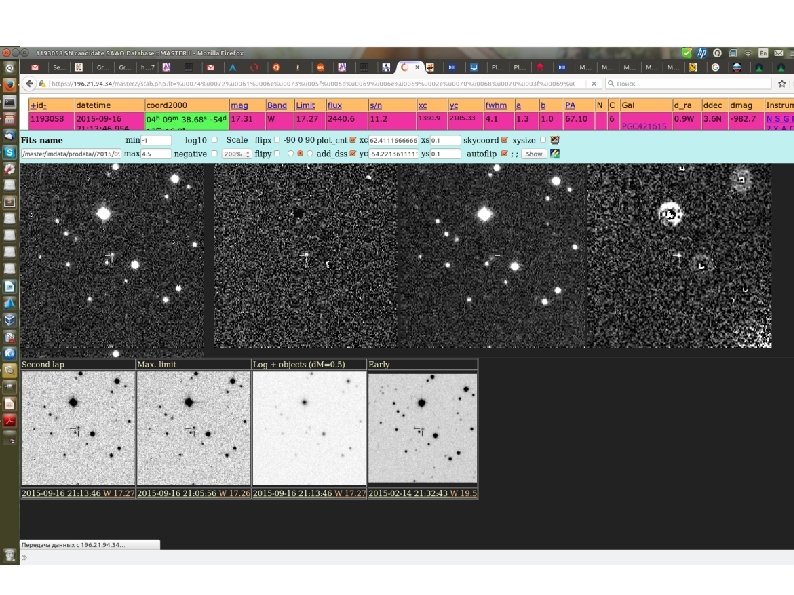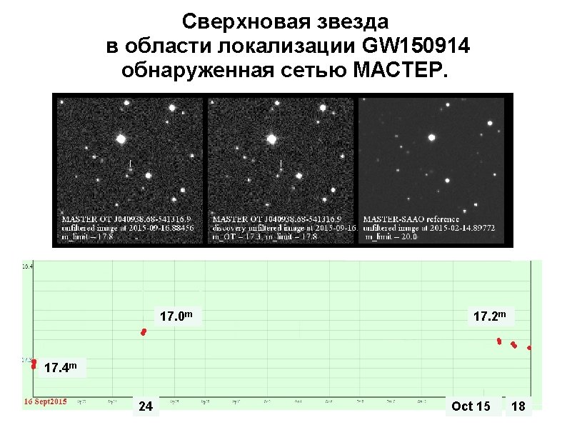 Сверхновая звезда в области локализации GW 150914 обнаруженная сетью МАСТЕР. MASTER-SAAO auto-detection system discovered OT source at (RA, Dec) = 04 h 09 m 38. 68 s 54 d 13 m 16. 9 s on 2015 -09 -16. 87912 UT. The OT unfiltered magnitude is 17. 3 m (the limit is 17. 8 m). The OT is seen in 5 images. There is no minor planet at this place. We have reference image without OT on 2015 -02 -14. 89772 UT with 20. 0 unfiltered magnitude limit. This PSN is in 0. 9"W and 3. 6"N from the center of galaxy PGC 421615 (Btot=18. 4 m). O. Gress et. al ATel #8065;