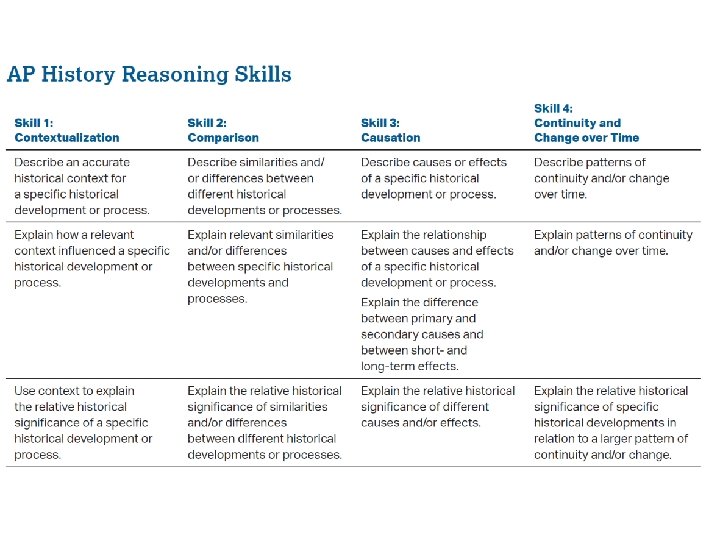 Analysis and Reasoning 1 pt. • Uses historical reasoning (e. g. comparison, causation, CCOT) to frame or structure an argument that addresses the prompt. OR 2 pts. • Demonstrates a complex understanding of the historical development that is the focus of the prompt, using evidence to corroborate, qualify, or modify an argument that addresses the question.
