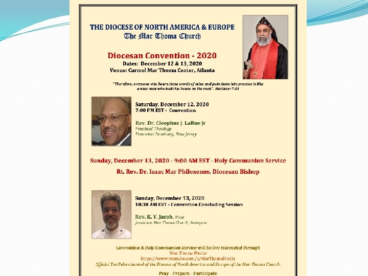 No mail in nominations and withdrawal would be accepted. Scrutinizing of Nominations received, Sunday, December 13 th, 2020 2: 30 PM at the church conference room. Opportunity will be given to withdraw candidacy until Friday, December 18 th, 2020 by 4: 00 PM. Eligible final list will be prepared and presented at 5: 00 PM Friday, December 18 th, 2020 and this will be published at the notice board at the church and also at the parish website www. limtc. org under publications. If more than one candidate for any of the above positions received, an election will be conducted on Saturday, December 26 th, 2020 from 8: 00 AM to 4: 00 PM. Place of Voting: The Long Island Mar Thoma Church, 2350 Merrick Avenue, Merrick, NY 11566. There will be a lunch break of one hour from 12: 00 PM - 1: 00 PM. Counting of votes, Saturday, December 26 th, 2020 at 4: 30 PM followed by results declaration. No mail in votes would be accepted for any positions. Organizational Representatives and Area Representatives - Prayer Groups Organizational Representatives and Area Representatives for Prayer Groups have to be elected via Zoom to be scheduled by the respective organization and Prayer Groups in consultation with the Vicar and results to be declared and informed to the Vicar and the Secretary. A copy of this Notice is placed at the Notice Board at the church and also posted at the parish website www. limtc. org under publications. By Order Kurien Thomas
