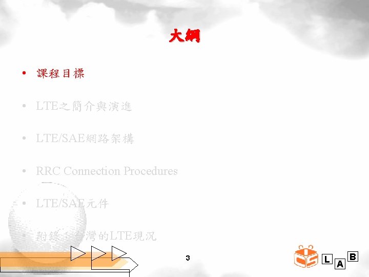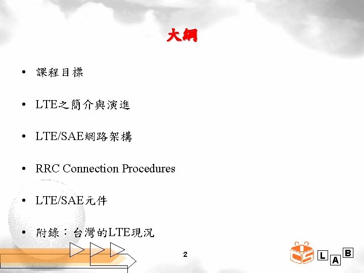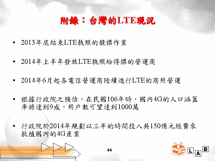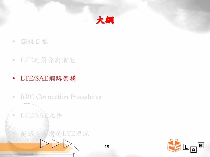3 GPP與LTE之演進 (Study on All IP Network) (MTC) Rel. 7 3 GPP Rel. 8 3 GPP Rel. 9 (LTE; 3. 9 G) 2009 2010 3 GPP Rel. 11 3 GPP Rel. 10 2013 2012 8 Rel. 13 (B 4 G) (LTE-A; 4 G) 2011 Rel. 12 2014 2015 2016 L A B