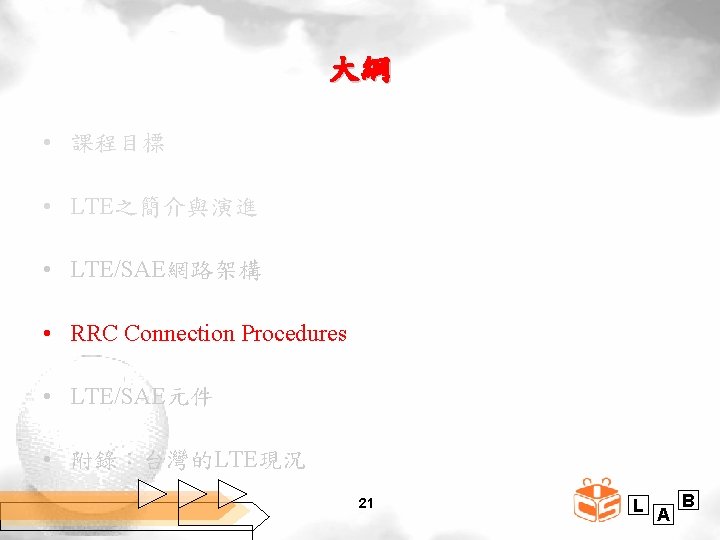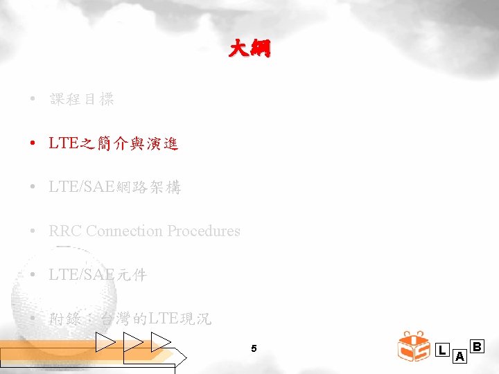 課程目標 • 讓 學 生 了 解 Long Term Evolution (LTE)的 Air Interface與 Core Network之演進 • Evolved Universal Terrestrial Radio Access Network Access Network (E-UTRAN)與 System Architecture Evolution (SAE)的網路架構 • LTE/SAE網路協定之RRC Connection Procedures之簡介 • Evolved Packet Core元件的相關知識 4 L A B