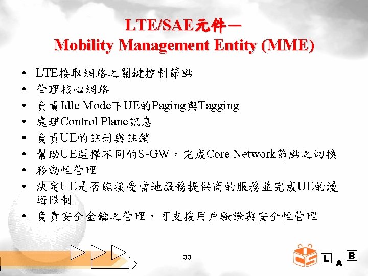 LTE/SAE元件- Evolved Packet Core (Cont. ) • Main Logical Nodes – Mobility Management Entity (MME) – Serving Gateway (S-GW) – Packet Data Network Gateway (PDN Gateway或P-GW) • Other Nodes and Functions – Home Subscriber Server (HSS) – Access Network Discovery and Selection Function (ANDSF) – Evolved Packet Data Gateway (e. PDG) – Policy and Charging Rules Function (PCRF) 32 L A B
