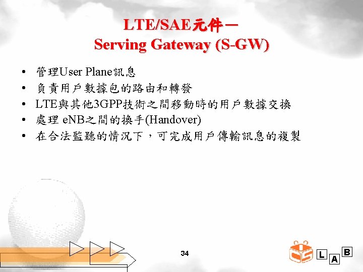 LTE/SAE元件- Home Subscriber Server (HSS) • • 包含與用戶相關信息和訂閱相關信息的中央資料庫 支援呼叫和會話建立(Call and Session Establishment) 用戶認證和訪問授權 HSS 植基於 pre-Rel-4 Home Location Register (pre-Rel. HLR) and Authentication Center (Au. C) 36 L A B