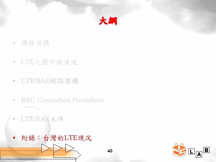 EPC Protocol Stack -P-GW Protocols • 包含 – S 5/S 8 Control Plane Stack • 支援與S-GW之間S 5/S 8 Interface • The integrated control plane stack for the S 5/S 8 interfaces consists of IP, UDP and Evolved GPRS Tunneling Protocol-Control (e. GTP-C) – S 5/S 8 Date Plane Stack • 支援與S-GW之間S 5/S 8 interface • The integrated data plane stack for the S 5/S 8 interface consists of IP, UDP and Evolved GPRS Tunneling Protocol-User Data Tunneling (e. GTP-U) 42 L A B