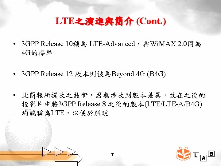 LTE之演進與簡介 • Long Term Evolution (LTE) 指3 GPP (The 3 rd Generation Partnership Project ) Release 8 以後的版本,主要為R 8、R 9 版本,亦被稱為 3. 9 G • 雖然 3 GPP R 8/R 9常被電信營運商誇稱為 4 G LTE,但嚴格 來說,直到 3 GPP R 10才真正符合國際電信聯 (International Telecommunication Union;ITU)的4 G標準 6 L A B