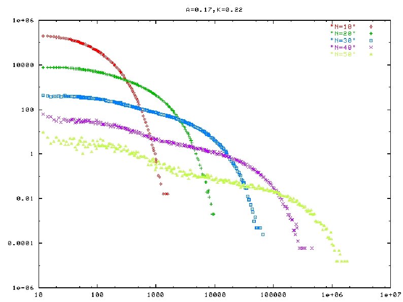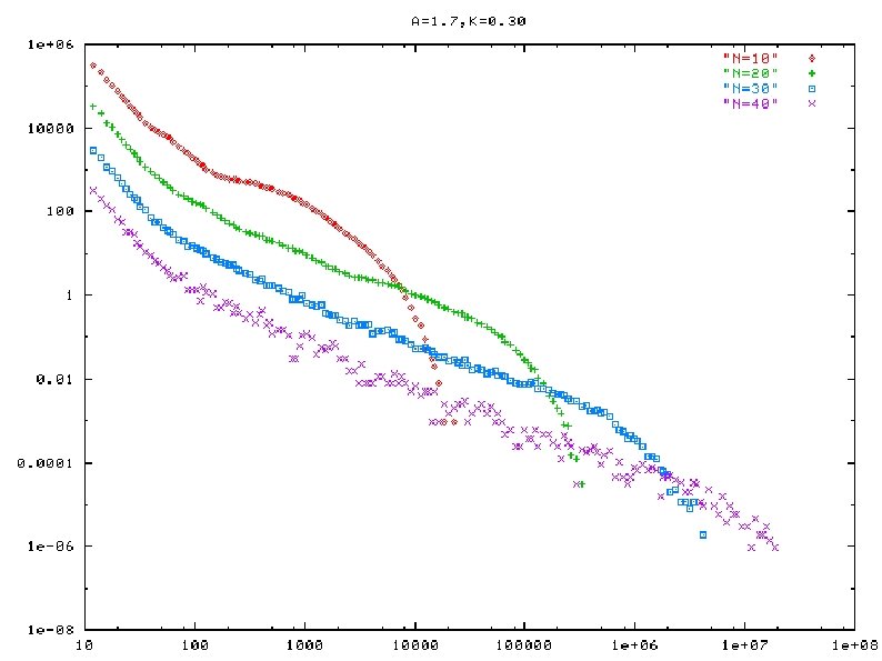 On the mechanism of apparent power-law ● ● ● (1) life-time distribution with fixed a, k and band-weight ratio(w) each of them exhibits clear exponential decay lifetime distribution for fixed a, k, w (2) life-time as a function of band-weight ratio and N (for fixed a, k) smooth dependence on w linear dependence of log(life time) on N Lifetime vs w, N (3) re-injection frequency as a function of band -weight ratio and N (for fixed a, k) smooth dependency on w linear/no dependence of log(life time) on N? Reinjection frequency (2) and (3) leads to emergence of the power-law range in life-time distribution width of the power-law range (in log-scale) that grows linearly with N