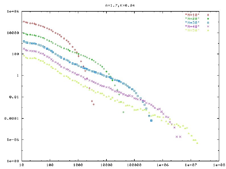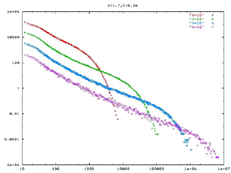 Frequencey distribution of band weight ratio a=1. 9, k=0. 34 horizontal-axis: band weight ratio vertical-axis: frequency( in log scale) plotted for a certain values of N a and k : fixed a=1. 9, k=0. 30 a=1. 7, k=0. 26 a=1. 9, k=0. 26 a=1. 7, k=0. 20